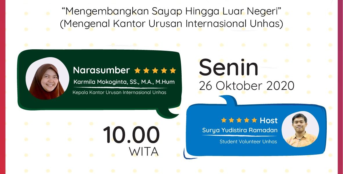 Di Brunch Talk #34 “Mengembangkan Sayap Hingga Luar Negeri” kita akan berkenalan dengan Ibu Kepala Kantor Urusan Internasional Unhas. Gimana sih proses internasionalisasi kampus Unhas itu? Yuk, temukan jawabannya di sesi kali ini. Jangan sampai ketinggalan yah!😉 — Ikuti terus informasi terkini seputar Unhas melalui akun resmi kami di: Instagram, Twitter, Line: @hasanuddin_univ Facebook Page, Youtube: Universitas Hasanuddin […]