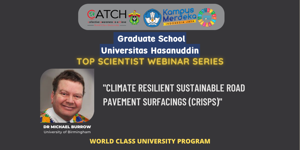 Top Scientist Webinar Graduate School, Universitas Hasanuddin Graduate School, Universitas Hasanuddin is inviting Lecturer, Student and Colleagues to join our Top Scientist Webinar Series “Climate Resilient Sustainable Road Pavement Surfacings (CRISPS)” Keynote Speaker: Dr Michael Burrow (University of Birmingham) Welcome Speech : Prof. dr. Budu, M.Med.Ed, Sp.M(K), Ph.D. (Dean of Graduate School, Universitas Hasanuddin) Opening […]