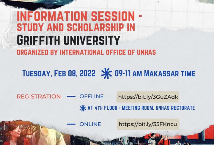 Information Session – Study and Scholarship in Griffith University will be held on Tuesday, Feb 8th, 2022 at 9-11 am Makassar Time. This event is organized by Unhas International Office.