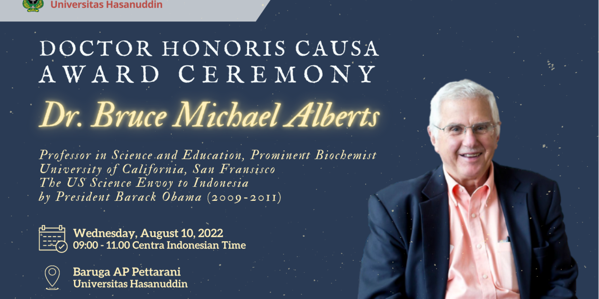 Universitas Hasanuddin will award Dr. Bruce Michael Alberts with the Doctor Honoris Causa, Professor in Science and Education and Prominent Biochemist from the University of California, San Fransisco. He was appointed to be the US Science Envoy to Indonesia by President Barack Obama in 2009-2011.
