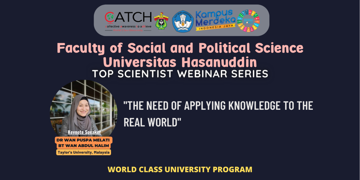 Top Scientist Webinar Faculty of Social and Political Science, Universitas Hasanuddin Faculty of Social and Political Science, Universitas Hasanuddin is inviting Lecturer, Student and Colleagues to join our Top Scientist Webinar Series “The need of applying knowledge to the real world” Keynote Speaker: Dr Wan Puspa Melati Bt Wan Abdul Halim (Taylor’s University, Malaysia) Welcome […]