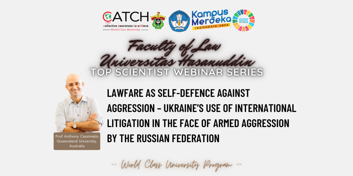 Top Scientist Webinar Faculty of Law, Universitas Hasanuddin Faculty of Law, Universitas Hasanuddin is inviting Lecturers, Students and Colleagues to join our Top Scientist Webinar Series “Lawfare as self-defense against aggression – Ukraine’s use of international litigation in the face of armed aggression by the Russian Federation” Keynote Speaker: Prof. Anthony Cassimatis (Queensland University, Australia) […]