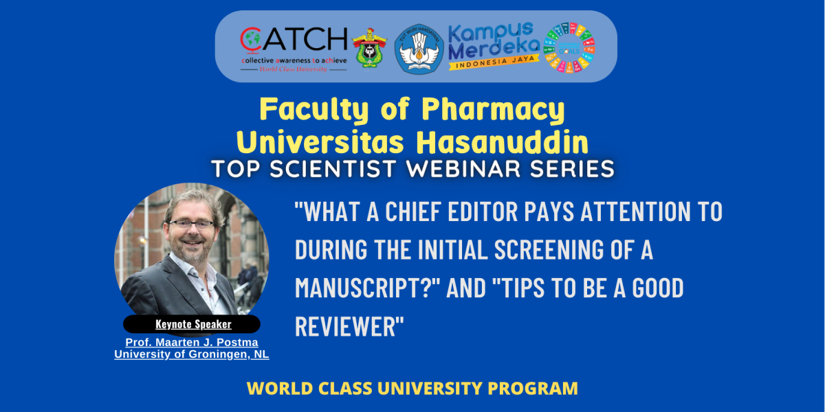 Top Scientist Webinar (Hybrid) Faculty of Pharmacy, Universitas Hasanuddin Faculty of Pharmacy, Universitas Hasanuddin is inviting Lecturer, Student,s and Colleagues to join our Top Scientist Webinar Series “What a Chief Editor pays attention to during the initial screening of a manuscript?” and “Tips to be a good reviewer” Keynote Speaker: Prof. Maarten J. Postma […]