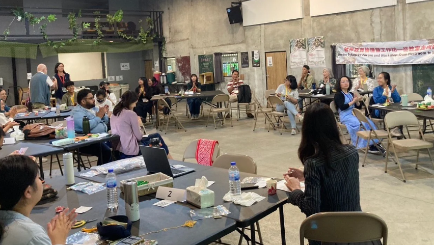 On the first day, activities centred on academic dialogue at the Hua-Shih College of Education, exploring topics such as cross-cultural pedagogy, Glocal Field Engagement, and the building of cross-boundary communities among graduate students. The second day took place at Datong Theatre, Hualien, featuring a community discussion under the theme “A Communal Way of Life with Neighborly Love and Care.” This session highlighted the voices of local Taiwanese practitioners and was followed by a collaborative workshop on “Interweaving and Connecting of Cross Stitch,” facilitated by NDHU’s master’s and doctoral students.