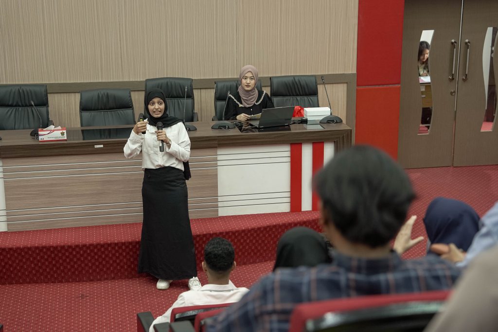 On Thursday, April 6, 2023, Duaa Al-Mashraqi, an international student from the Faculty of Medicine, and Mohammed Hussein, an international student from the Faculty of Engineering, presented their home country, Yemen, to local and international students in the Prof. Dr. Latanro Program Hall, Faculty of Economic and Business (FEB). The International Office (IO) hosted this Geography Series (GS) on a monthly basis.