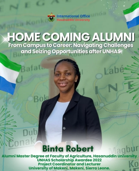 The International Office (IO) of Hasanuddin University (UNHAS) recently held a special session with one of the alumni currently residing in the United States of America (USA). The event, titled “Home Coming Alumni,” took place on Friday, 7 November 2025, at 9:00 AM Makassar time. This edition of the session featured Ms. Binta Rosline Roberts, an alumna of the Master’s Program in Food Science and Technology, Faculty of Agriculture.
