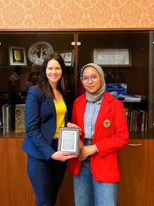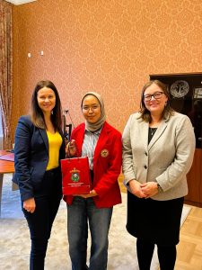 Karisma Nurul Izzah, one of the 2022 IISMA Awardees, presents Hasanuddin University plaque to Vice-Rector for Communication and International Office, Vytautas Magnus University, Lithuania. Vytautas Magnus University also responded very positively to this. One of the functions of IISMA Awardees is to become ambassadors for their home universities. Karisma as one of the awardees has carried out her duties very well.