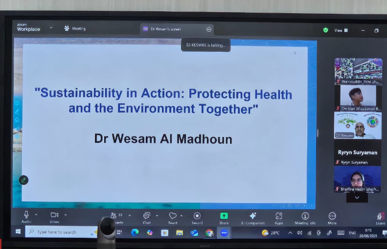 Dr. Madhoun delivered a compelling lecture titled “Sustainability in Action: Protecting Health and Environment Together,” emphasising the urgent need for collaboration between health and environmental sectors. As the founder of the Global Ambassadors of Sustainability and a board member at the Climate Change Centre at Arab American University, he shared insights drawn from both expertise and personal experience.