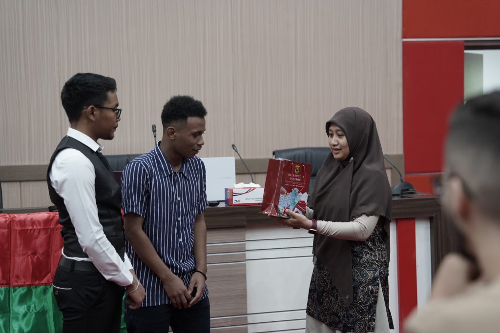 Before ending the G-Series, the moderator invited Robusta to present one song for all participants. This was the first time in the G-Series presentation, the international students sang a song of You Raise Me Up by Josh Groban in two different languages. The Madagascar lyrics made the song sound more unique and amazing. The G-Series came to an end with a token presentation to the presenter by Andi Masyitha Irwan, Ph.D (Head of IO). While handing the token to Giovanni, Ms. Masyitha conveyed her gratitude towards the Madagascar presentation and reminded the participants to keep their eyes on the IO G-Series which would be held monthly. The Head of IO and her staff, the Madagascar students and all participants took a photo session and went home. See you next month with a different presentation!