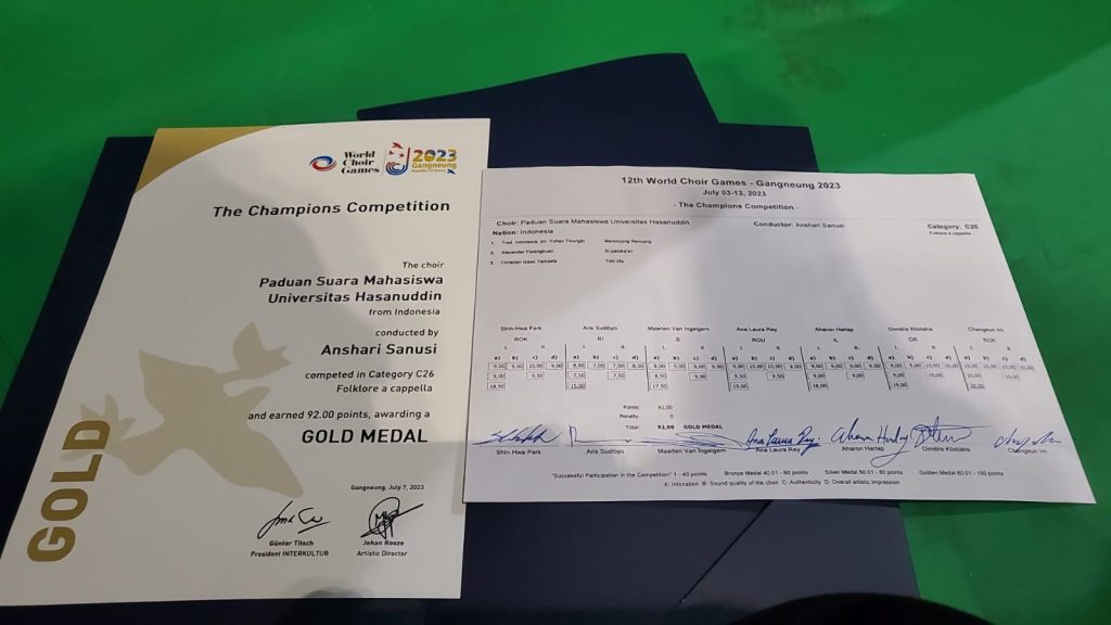 Hasanuddin University (UNHAS) students in South Korea were able to secure a gold medal in the World Choir Games held in 2023. The group, which featured 27 members, was able to claim victories in the categories of scenic folklore and Folklore a cappella.