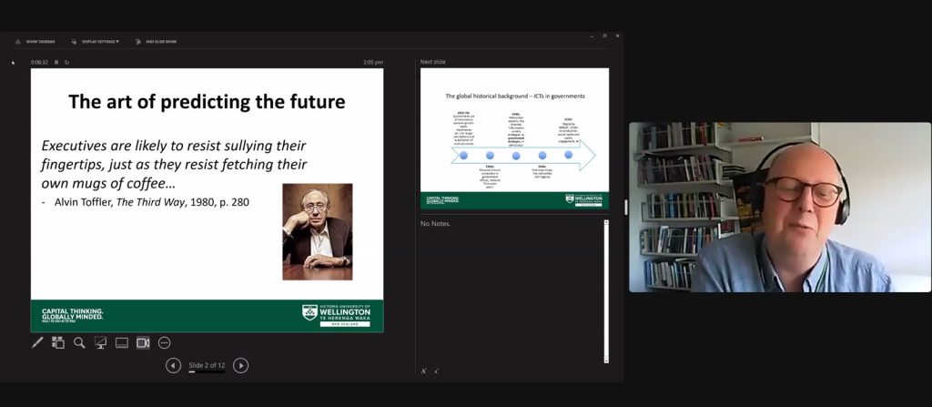 In his presentation, Prof. Karl began by explaining the global historical background starting from the 1950-70s, up to the development of digitalization in the current period. In his discussion, he tried to define that e-government focuses on channels and interfaces in delivering information and public services. He also quoted Norris (2010) who said that e-Gov provides electronic government information and services 24 hours per day, 7 days per week. Although sometimes these changes are not maximized by policymakers, they tend to just be used as buzzwords or just jargon without being balanced with the implementation that effectively solves public problems.