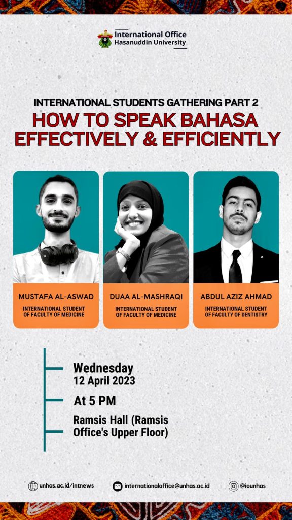 Dear International Students. We are pleased to invite you to our International Student Gathering #2, Sharing Session: “How to Speak Bahasa Effectively & Efficiently”, and also Iftar Party on this Wednesday, 12 April 2023 at 5 pm at Ramsis Hall. It will be a pleasure for us to have you.