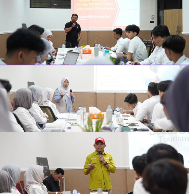 The training provided an engaging and inspiring learning atmosphere. Selected participants took part in a series of interactive sessions, including How to Be an Effective Volunteer delivered by Nirma Hasyim, S.IP., M.A., Introduction to South Sulawesi Tourism Objects by the Provincial Tourism Office of South Sulawesi, Public Speaking by Dr. Eddyman W. Ferial, M.Si., and Hospitality Management presented by Yovie from the UNHAS Hospitality Center (UHC).