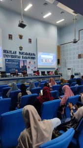 The event was preceded by speeches from the Dean of Graduate School, Hasanuddin University (Prof. dr. Budu, M.Med.Ed., Sp.M(K)., Ph.D.) and Vice-Rector of Partnerships, Innovation, Entrepreneurship, and Business (Prof. Dr.Eng. Adi Maulana, S.T., M.Phil.). About 110 people attended the lecture, with students and lecturers making up the majority of the audience.