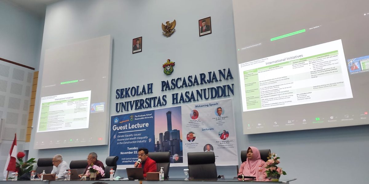 As a multidisciplinary faculty, The Graduate School Hasanuddin University organized a guest lecture on the cross-discipline topic of gender and engineering under the heading “Gender Equality Issues: Income and Wealth Inequality in the Construction Industry.” On Tuesday, November 22, 2022, the lecture took place offline in the Prof Fachruddin Lecture Theatre. For those who couldn’t attend in person, the lecture was live-streamed on Youtube. Dr. Toong Khuan Chan from the University of Melbourne, Prof. Dr. Ir. Krishna Suryanto from the Bandung Institute of Technology, and Prof. Ir. Baharuddin Hamzah from Hasanuddin University made up the lecturing panel. Evi Aprianti, S.T., Ph.D. moderated the discussion (Lecturer at The Graduate School).