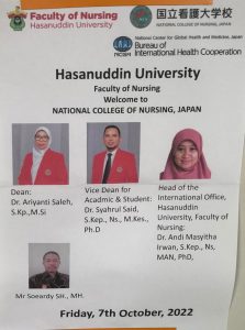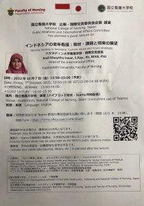 On October 7, 2022, Hasanuddin University (Unhas) Faculty of Nursing lecturer, Andi Masyitha Irwan, S.Kep., Ns., MAN., PhD, who is also the Head of the Unhas International Office, gave a guest lecture at the National College of Nursing, Japan (NCNJ) entitled “Current Practice and Future Strategies of Gerontic Nursing in Indonesia” in front of 50 NCNJ students and lecturers who attended directly at the NCNJ auditorium or through online mode.