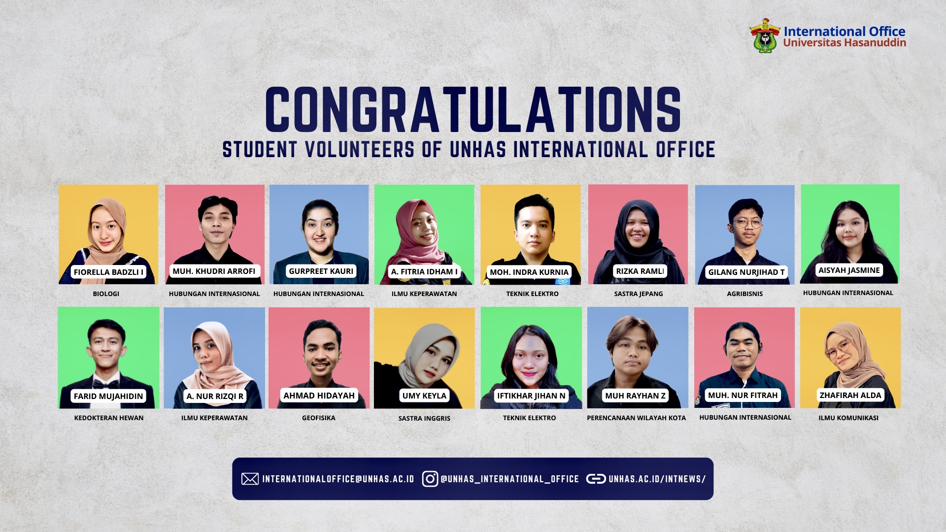 The International Office Student Volunteer (SV) is a team of students selected by the International Office (IO) to assist international students in various student affairs. The IO has never had student volunteers before. This student volunteer is expected to be a kind of double benefit for the IO and also the students involved. The benefits obtained by the IO can be in the form of assistance to help foreign students who come to Unhas. In addition, the SV can also be a supporting team for international activities carried out at Unhas, such as international conferences and seminars, and so on.