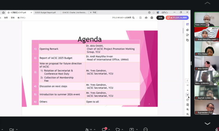 On Monday, 23 March 2026, the International Academic Consortium for Sustainable Cities (IACSC) held a coordination meeting at the IACSC Center, Yokohama City University (YCU), Japan. The primary agenda focused on the accountability report from Hasanuddin University (UNHAS), which served as the host for the previous year’s IACSC Annual Meeting. The session was attended by representatives from all member institutions, including Yokohama City University (Japan), Universiti Sains Malaysia (Malaysia), the University of the Philippines (Philippines), Thammasat University (Thailand), Vietnam National University (Vietnam), and UNHAS (Indonesia).
